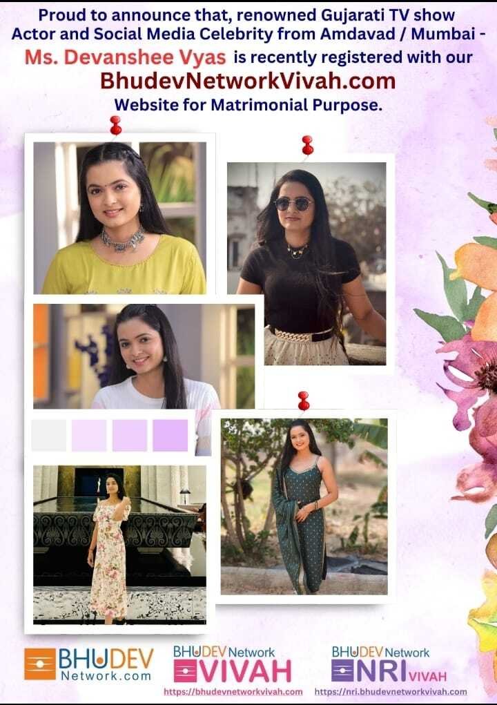 Proud to announce that, renowed Gujarati TV show Actor and Social Media Celebrity from Amdavad / Mumbai- Ms. Devanshee Vyas is recently registered with our BhudevNetworkVivah.com website for Matrimonial Purpose.